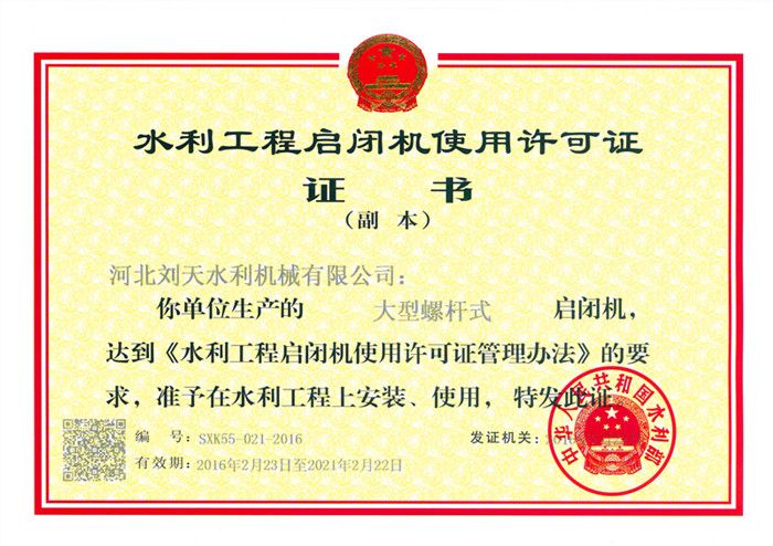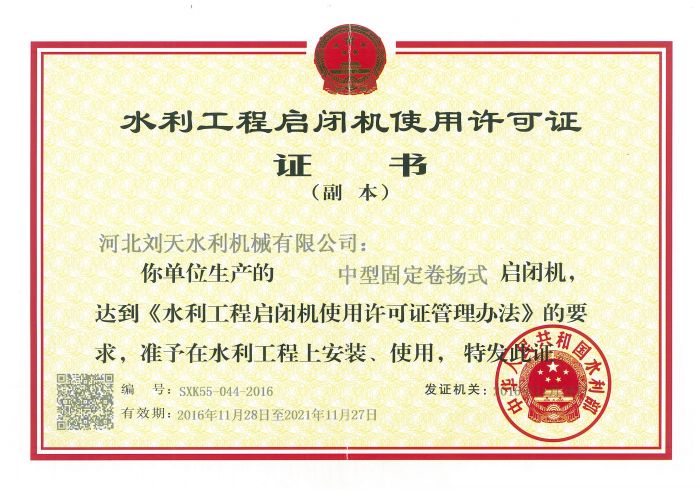 啟閉機使用許可證-中型固定卷揚式啟閉機